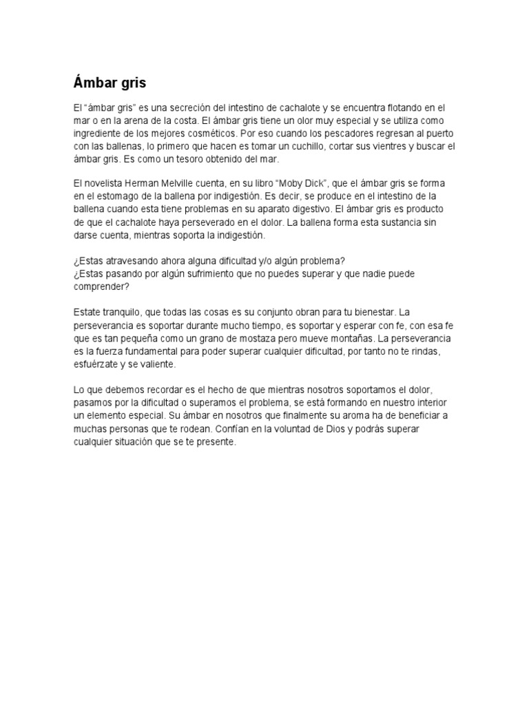 1 debido a que se han hallado trozos de ámbar gris con picos de calamares gigantes incrustados. El ámbar gris tiene su origen en el intestino de los cachalotes, pero es que además, el ámbar gris. É raro, e a fragrância que ele exala é tão rara quanto. Es la materia fecal de los cachalotes, que se tasa por cantidades exorbitantes para producir perfume. Esta masa es lo que se conoce como ámbar gris.